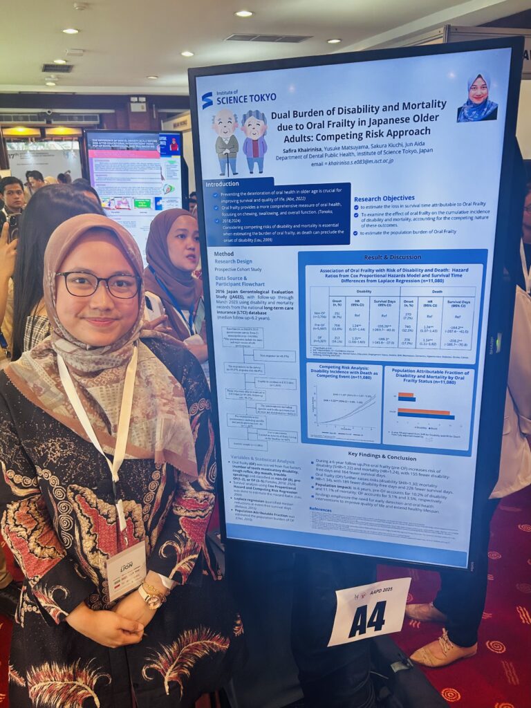 大学院生のSafiraさんが、第17回Asian Academy of Preventive Dentistry 「Innovation in Dental Public Health and Preventive Dentistry: Bridging Gaps for Better Oral Health」(2025年9月2日~4日、インドネシア・バリ開催)にて、「Dual Burden of Disability and Mortality from Oral Frailty among Japanese Older Adults: A Competing Risk Approach」というタイトルで発表を行いました。